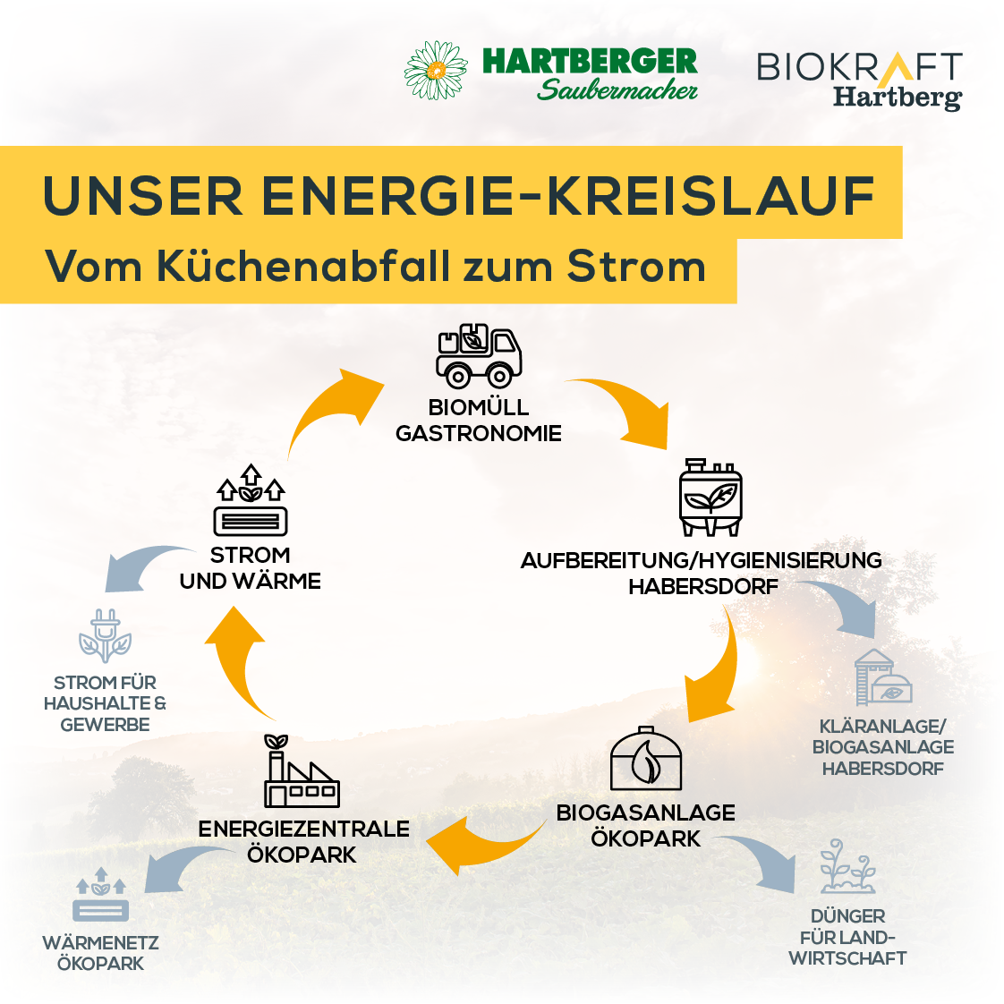 Aus Gastronomieabfällen wird in unserem Energie-Kreislauf umweltfreundlicher Strom für Haushalte und Gewerbe sowie Wärme für unseren Eigenverbrauch in der Kläranlage und dem Ökopark Hartberg erzeugt. Die Reste dienen als zertifizierter Dünger in der Landwirtschaft.