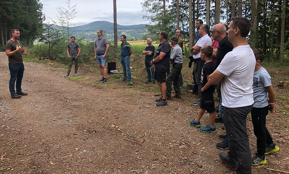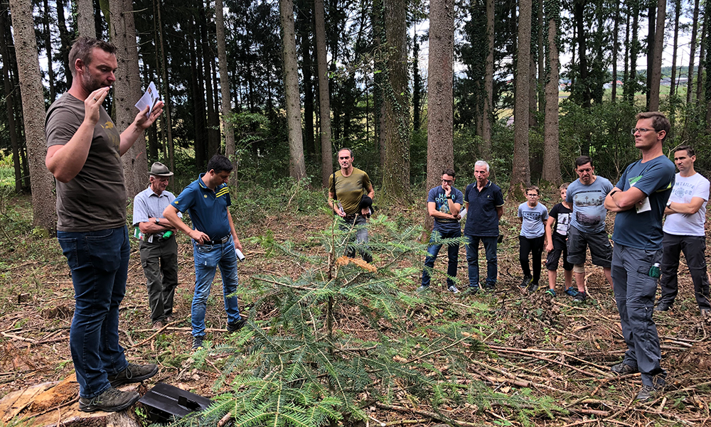 „Wichtig ist eine vollständige und rasche Schadholzaufarbeitung. Die gute Nachfrage der Heizwerke begünstigt eine rasche Aufarbeitung und Lieferung von Hackgut aus dem befallenen Kronenmaterial. Den Waldbesitzern empfehlen wir dringend eine wöchentliche Kontrolle aller gefährdeten Fichtenwälder“, so DI Harald Ofner, Geschäftsführer des Waldverband Hartberg/Fürstenfeld. Er lieferte bei der forstkundlichen Exkursion der KLAR! Wirtschaftsregion Hartberg im Rahmen einer Begehung von Waldflächen den interessierten Teilnehmern hilfreiche Praxistipps zum Erkennen befallener Bäume, zu Maßnahmen bei Befall, zur Aufforstung und Baumartenwahl sowie Informationen rund um rechtliche Bestimmungen und Fördermöglichkeiten.