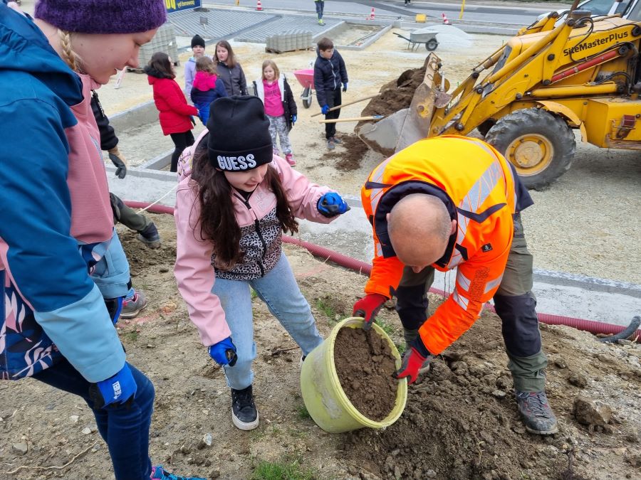 Grafendorf: Kinder der Volksschule Grafendorf pflanzten ihre 10-Jahrezeitenhecke neben dem großen Besucherparkplatz hinter der Volksschule und Mittelschule Grafendorf.